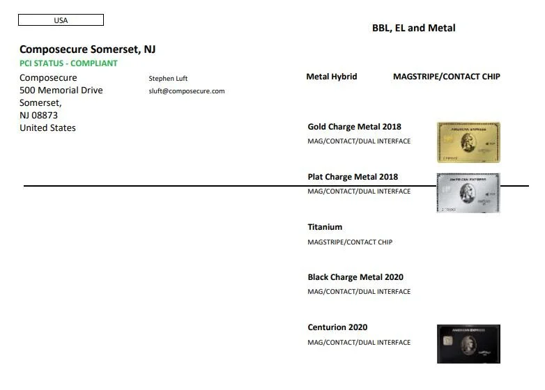 If you would like to follow along, you can find the American Express GNB Vendor list PDF here. If you scroll down to page number 51 out of 65, you can see a section for a company called CompoSecure out of Somerset, New Jersey. CompoSecure appears to be a compliant manufacturer of metal and metal hybrid credit cards, which include magstripes, contact chips, and dual interface for American Express Cards. On the CompoSecure website we found that they are an award-winning credit card design and manufacturing company that is responsible for designing most of the popular metal card products on the credit card market today. Their product list includes the Platinum Card from American Express, American Express Rose Gold, the Chase Sapphire Reserve, the JPMorgan Reserve, and the Capital One Venture.