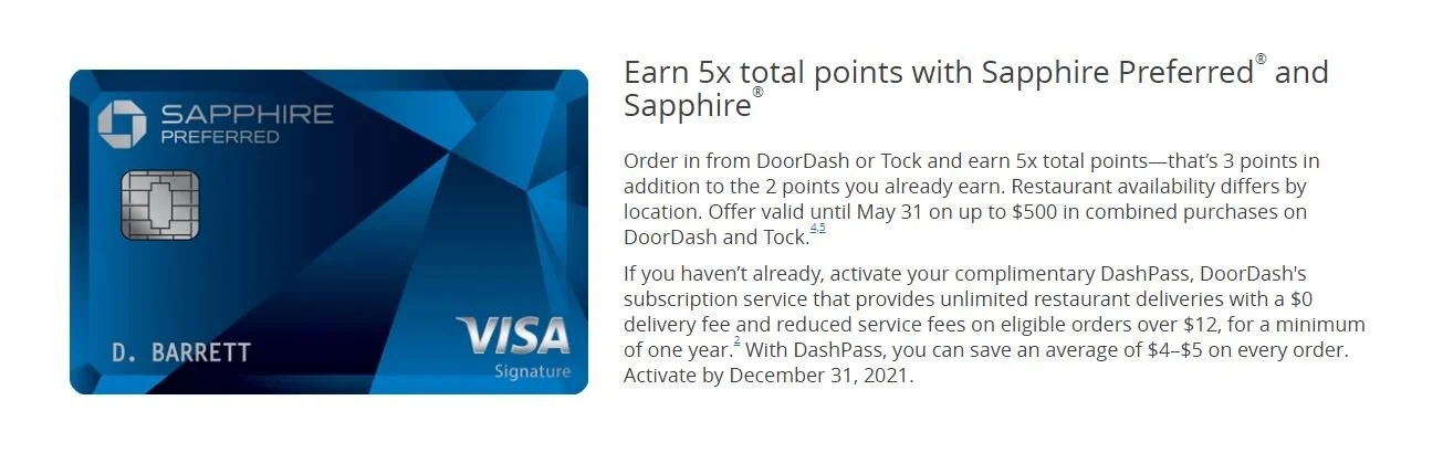Chase has teamed up with DoorDash and Tock food delivery and takeout services by increasing your already rewarding Chase Sapphire and Freedom products to earn up to 5X back on all purchases through their mobile apps. Through May 31, 2020, you will earn a massive 5X Ultimate Rewards Points when paying with your Chase Sapphire Reserve, Chase Sapphire Preferred, Chase Freedom or Chase Freedom Unlimited when ordering food delivery or takeout with DoorDash or Tock.
