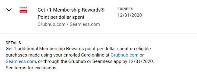 American Express is also increasing the rewards earnings for delivery and take out services by launching a profitable Amex Offer. This provides +1 extra Membership Rewards Point per dollar spent using Grubhub or Seamless, for those who have the targeted offer on their card. American Express has been partners with Grubhub and Seamless food delivery services since the revamped launch of the American Express Gold Card in 2018. American Express Gold Card holders get a $120 dining credit annually, which is dividing into $10 per month increments. This dining credit can be used toward delivery and take out service orders from Grubhub and Seamless!