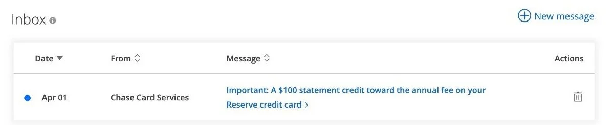 If you are wondering how to get your $100 statement credit, all you need to do is wait for a "Secure Message" from Chase Card Services within your Chase online account. The message will arrive in your inbox and read "Important: A $100 statement credit toward the annual fee on your Reserve credit card". Our secure message arrived on April 1, 2020. See screenshots below.