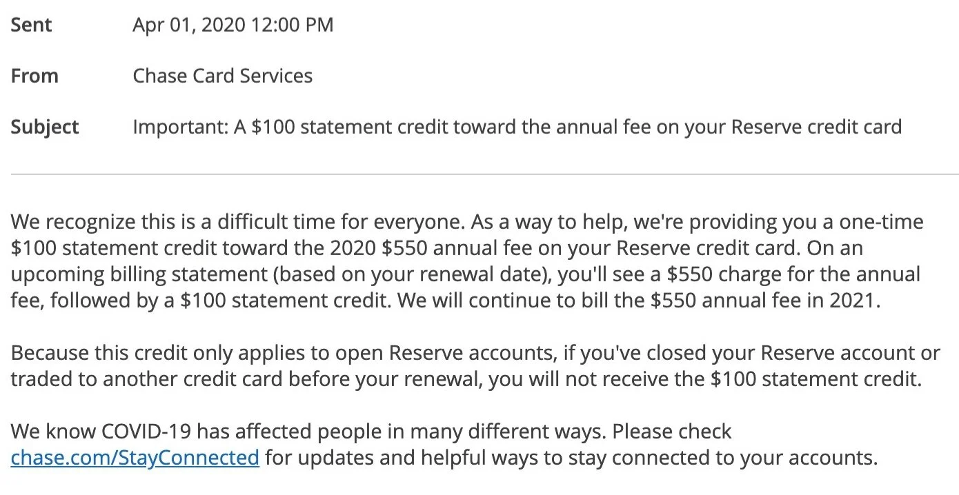When you open the message, Chase explains that they recognize the difficult times for everyone and that they will be providing this $100 statement credit for upcoming annual fee renewals. The way the $100 statement credit works is that you will see your annual fee charge for $550 appear on your billing statement, which will be followed by a $100 statement credit. Again, this means that your annual fee for 2020 will only cost $450 upfront before you use your other benefits and statement credits. Chase makes sure they noted that for 2021, the $550 annual fee would continue.