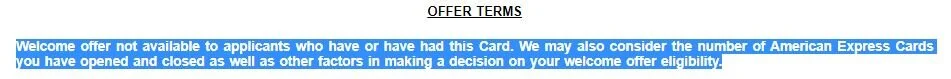The first American Express rule pertains to the welcome bonus. American Express has a hard rule that if you have earned a welcome bonus for a specific product, you are now forever ineligible for the welcome bonus on that product. For example, if you apply and receive the welcome bonus for the Platinum Card from American Express in 2015, then cancel in 2016, but want to re-apply in 2020, you will not be eligible for another welcome bonus with your 2020 application, even though you’ll probably still be approved for the Platinum Card from American Express. Simply put, you can only get one welcome bonus per product in your lifetime. That said, there may be several variations of a card type, and each variation is technically its own product. Overall, American Express is pretty rigid and clear about this rule. In our experience, there is no way to get around it.