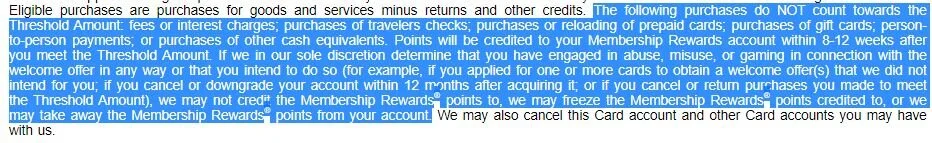American Express makes it very clear that you should not engage in abuse, misuse, or gaming in connection with the welcome offer. This means American Express does not want members conducting manufactured spending, such as purchasing any cash equivalents, like gift cards or travelers checks or sending money peer to peer using their credit. There is a no tolerance attitude with American Express regarding this and the decision to black list you is based on their sole discretion. Remember they don't have to lend money to anyone they don't want to, or who they feel are churning or trying to cheat the system.
