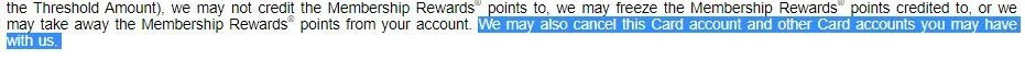 If you cancel or downgrade your account within 12 months after acquiring it, or cancel or return purchases you made to meet your welcome bonus minimum spending requirement, American Express has the right to claw back your welcome bonus, freeze all of your membership rewards points, or remove the Membership Rewards from that single card account or ALL of your accounts. American Express may also cancel that specific card account or other card accounts you may have with them. Usually if this occurs, you will be considered black listed and may never be able to get an American Express card ever again.