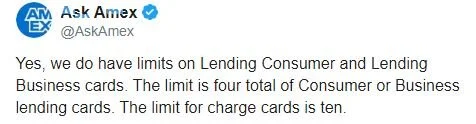 American Express has had a soft 5 or 6 credit card limit in the past, which could be circumvented by calling into the reconsideration line if your creditworthiness, income and risk factors made sense for American Express' approval tolerance. As of May 19, 2020, the Ask Amex Twitter account advised that American Express does in fact have a credit card limit including business and personal cards of only FOUR (4) credit cards. For example if you have two business cards and two personal cards (or any combination for 4 total), you will likely not be approved for a 5th anymore. As for charge cards, the limit is TEN (10), presumably including business and personal combined like for the credit card totals.