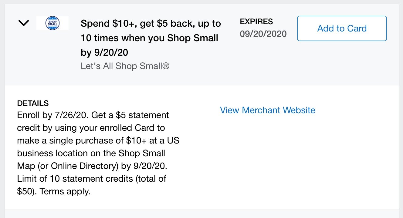 First, you need to visit your American Express mobile application or log into your account via the web browser. Go to your Amex Offers and add the "Spend $10+ get $5 back, up to 10 times when you shop Small" offer. This specific Amex Offer appeared on all of our American Express cards, including the Platinum Card from American Express, American Express Gold Card, Hilton Honors American Express Aspire Card, and American Express Marriott Bonvoy Brilliant. This Amex Offer is also available on American Express business cards. We activated this Amex Offer on our American Express Gold Card because we plan on using it to try out local coffee shops and smaller lunch spots! This way, we will still be optimizing our earnings of 4X Membership Rewards points from dining, while taking advantage of the Amex Offer and earning statement credits. It appears that you can only add this Amex Offer to a single card within your account, so make sure you choose wisely! Once you add it, you cannot un-add it. Cardmembers must activate this offer before July 26, 2020, to take advantage of it.