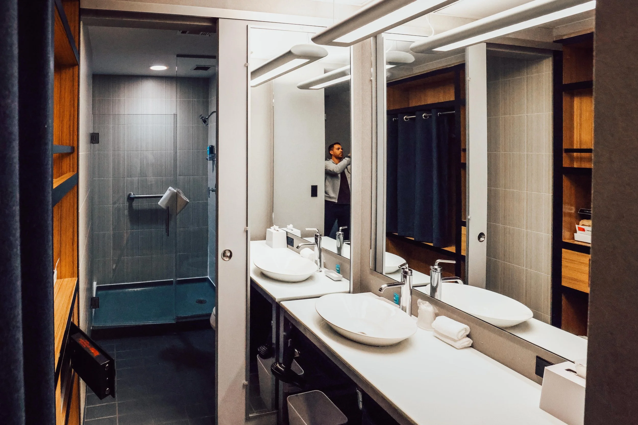 The shower and bathroom area was basic but functional. Limited amenities like a small coffee maker were nice but nothing crazy. The toilet and shower had a pocket door from the vanity and sink, While there is no door dividing the bathroom vanity from the rest of the open concept room, this is still largely functional for multiple people stay in the room together,