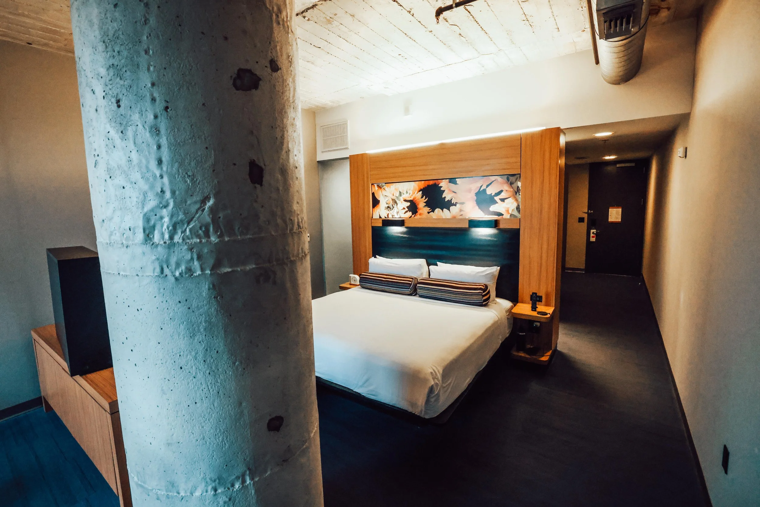 The Savy Suite King Room at the Aloft Downtown Dallas. The columns are part of this historic building and add to the industrial chic design of this Aloft property. While their placements felt awkward at times, it was something we got used to and wasn't horrendous.