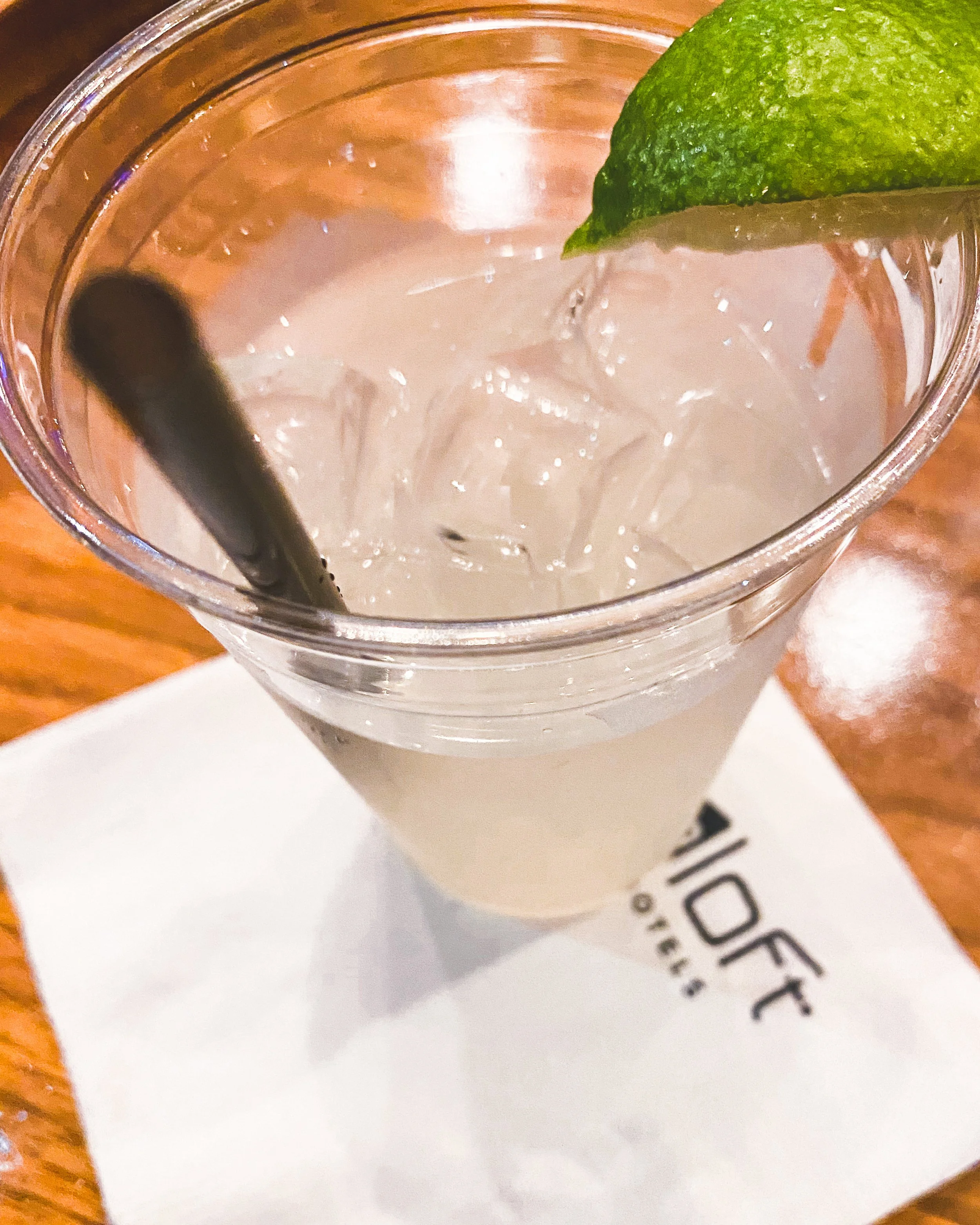 I asked for a mojito but due to COVID-19, they didn't have mint at the W XYZ Bar. The bartender crafted this Moscow mule-ish cocktail for me instead. Note the plastic cups being used instead of the glassware normally found at Aloft hotels.