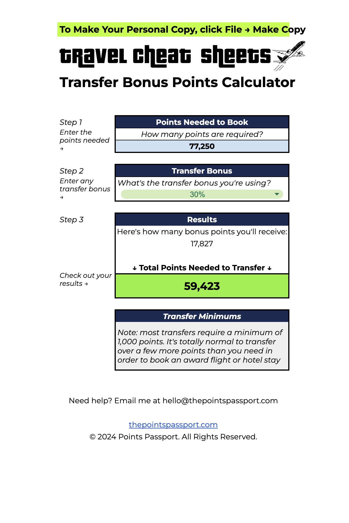 This is where my Travel Cheat Sheets come into play. Inside this digital product, you’ll find a Transfer Bonus Calculator that helps you determine how many Amex points to transfer to British Airways to maximize your Avios. This tool makes it incredibly easy to use transfer bonuses like the one we discussed. If you want to ensure you’re getting the best value for your points, you’ll want to check out my Travel Cheat Sheets!